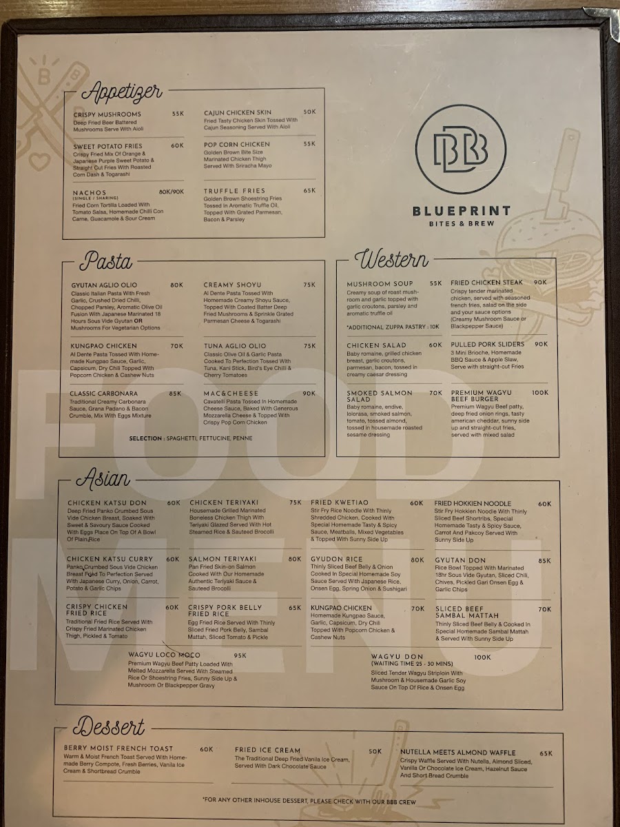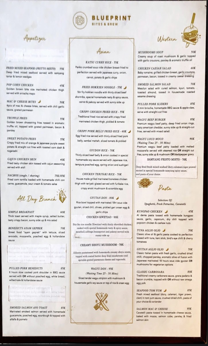 Welcome to Blueprint Bites & Brew, a culinary haven nestled in the heart of Jakarta, where the essence of both Indonesian and Western cuisines come together at accessible prices. Each dish is crafted with care, boasting beautiful plating, a testament to the cafe's commitment to quality. Highlights from the menu include the famous loco moco, featuring a juicy hamburger topped with creamy sauce, and the delightful fried rice with crispy pork belly, which diners rave about.